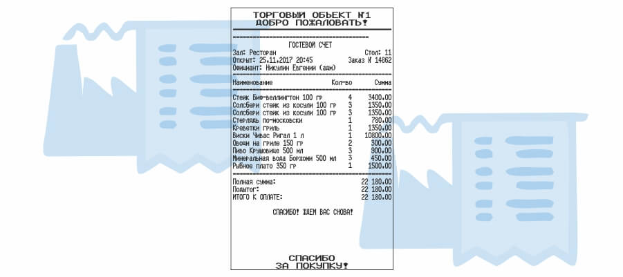 Ресторанный чек, образец которого вы можете отметить на нашем сайте, содержит последующие данные: 1. дату и момент выдачи чека; 2. список заказанных блюд; 3. их стоимость; 4. сведения о лице, напечатавшего для вас акт; 5. подпись уполномоченного лица, печать фирмы.